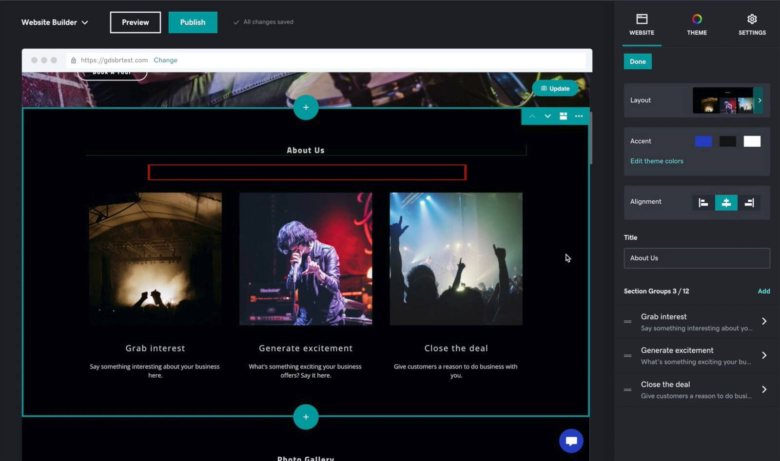 Pages in GoDaddy are built by adding pre-designed sections. Here are some examples: