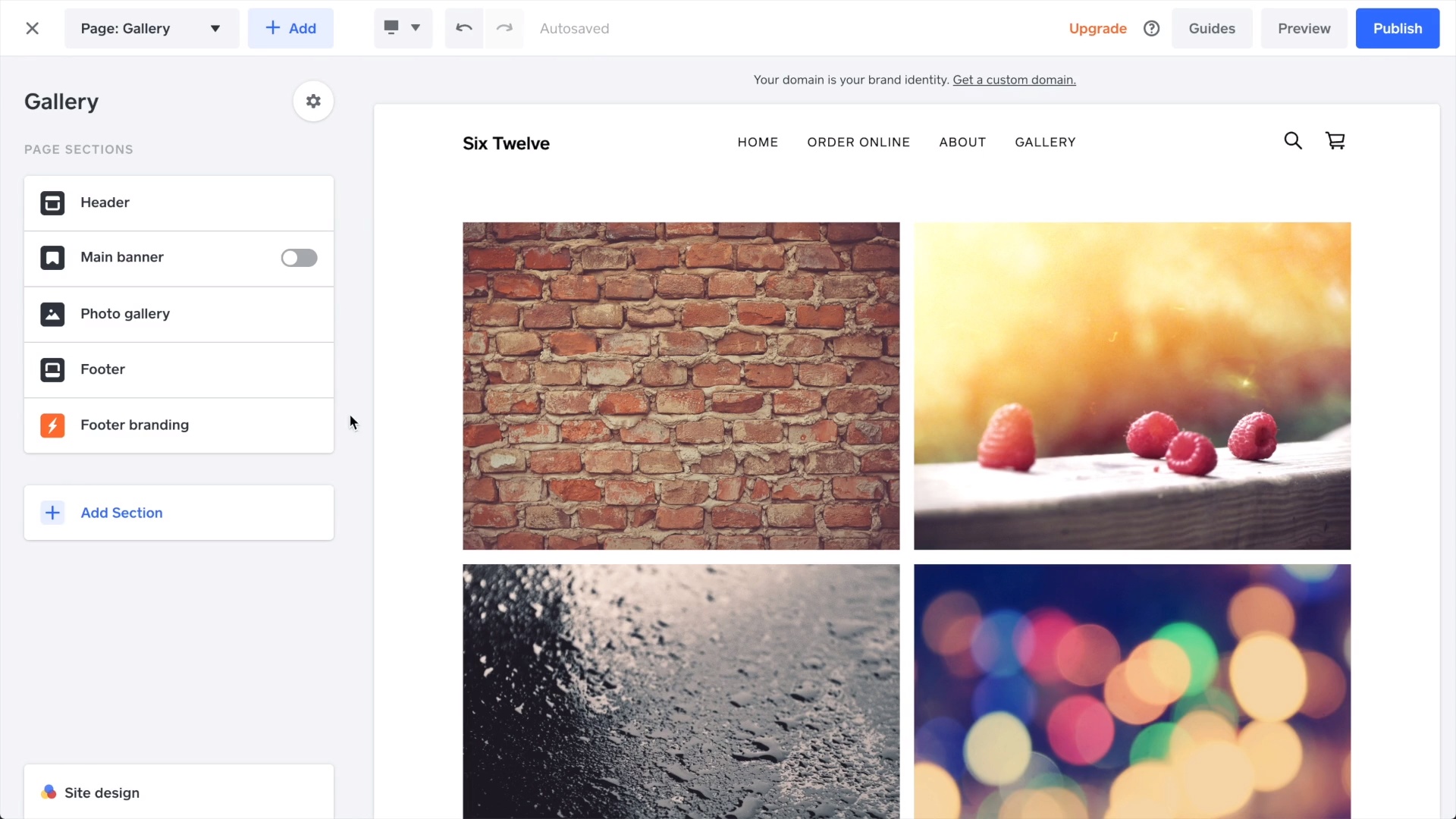Square Online pages are built by adding pre-designed sections. You can toggle individual elements on and off but can’t add additional elements.