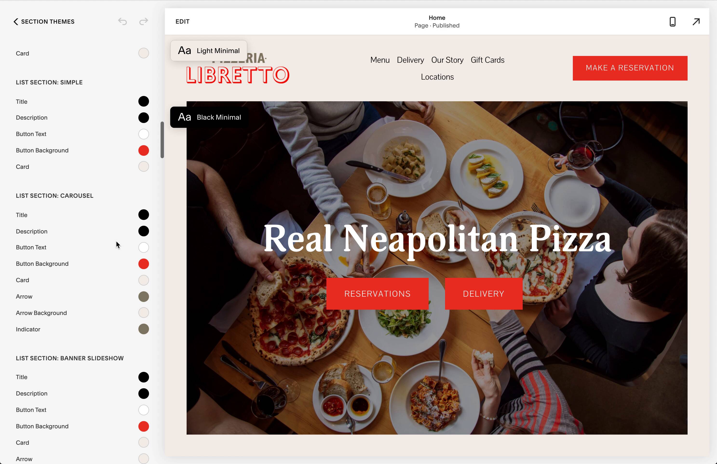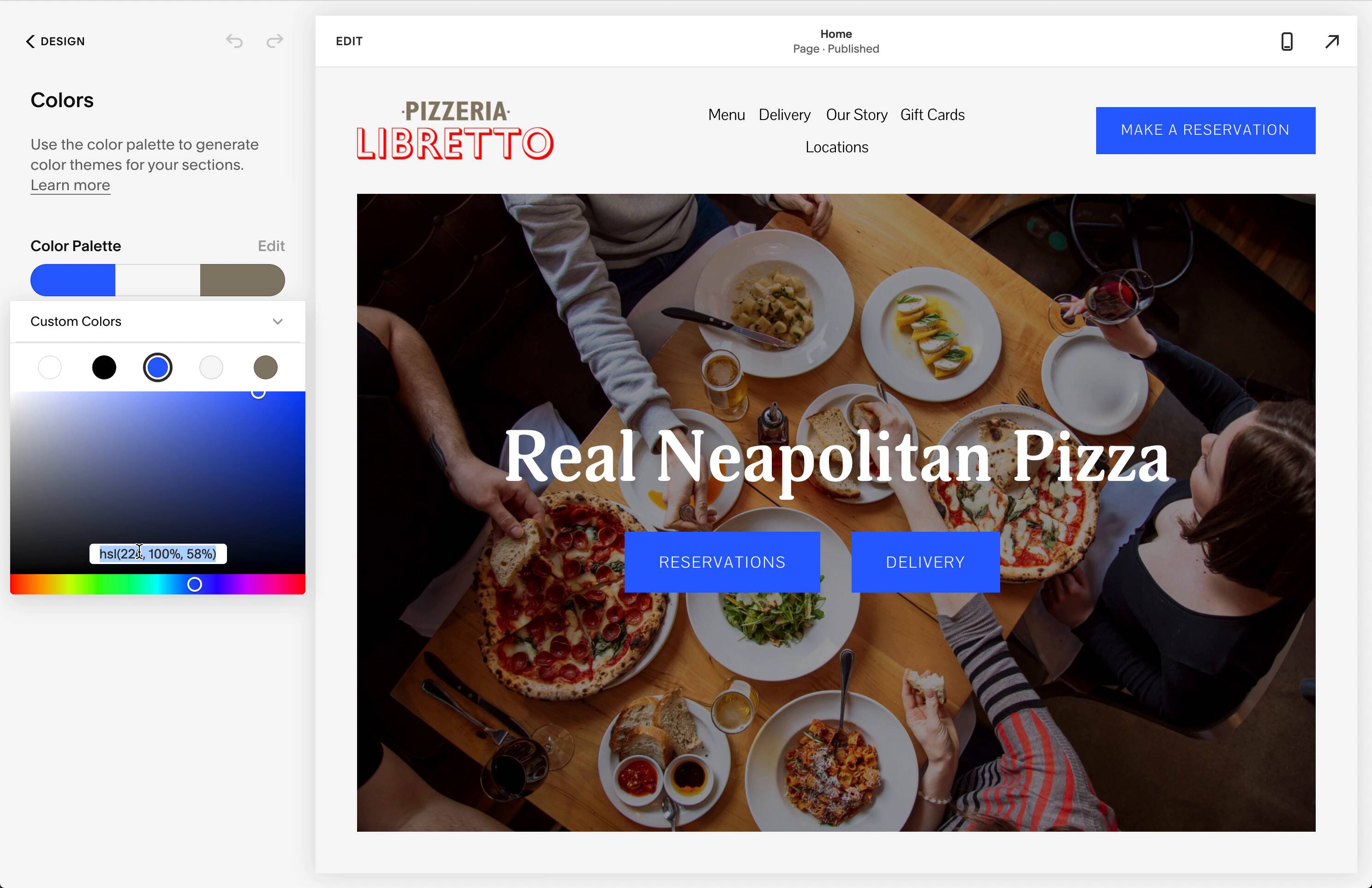 One thing I love about Squarespace is it’s really easy to implement brand colors. All you have to do can edit the color palette— this took me two minutes for Pizzeria Libretto: