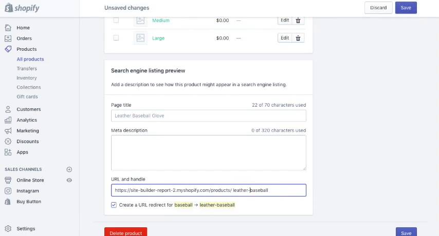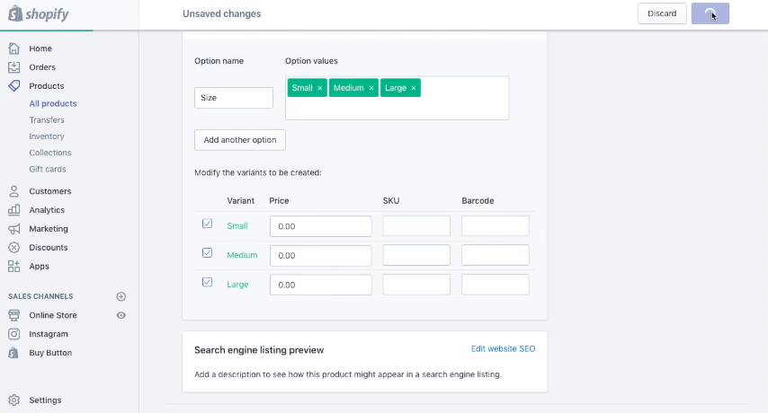For example, consider product variations (ie: sizes and colors). Variations can be become complex once you consider different SKUs, stocks, weights and prices. To deal with the complexity, Shopify broke variations into two editors: the first editor is a way to quickly manage variations and when you need to drill down into the details, you dive into the second editor. This lets users move quickly— but also with depth.