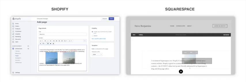 Case #1: I recommend Squarespace over Shopify if you want an ecommerce website and a content website. Shopify is great for ecommerce but it’s not great for maintaining content— the WYSIWY editor isn’t as user-friendly and powerful as Squarespace’s drag-and-drop page editor.