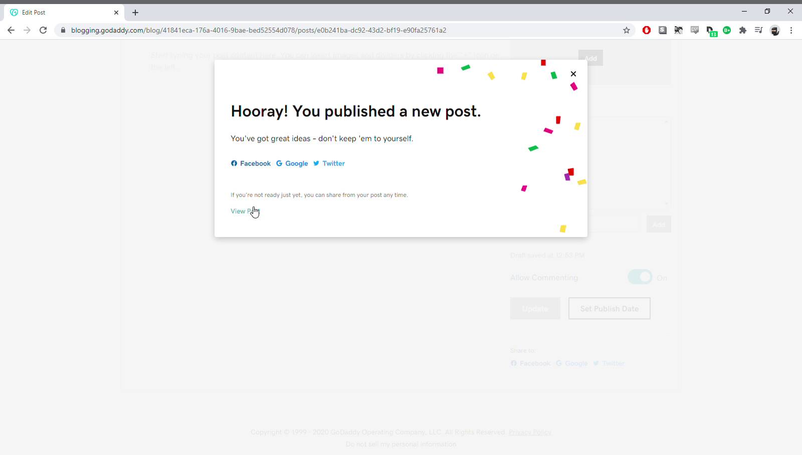It’s the same thing with other types of content, like blogs. To add or edit your posts, you need to leave the GoDaddy editor and go to their blogging interface. When you’re done and go to publish, GoDaddy warns you that your post isn’t live until you save changes in the editor.