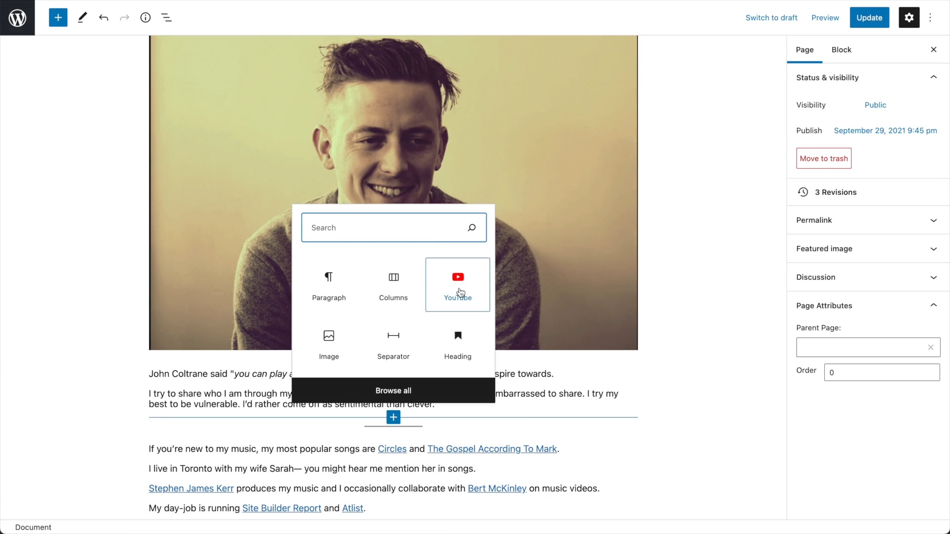 Note: You can install a WordPress plugin called Elementor that makes WordPress’s page editor more like Squarespace. It sort of gets there but it’s also just not the same ease of use.