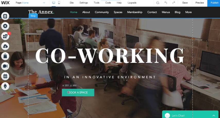 Wix’s editor is unstructured and gives you the freedom to drag and drop elements anywhere on a page. There’s no rigid, predetermined structure to limit you. It’s even possible to move a piece of content by a single pixel at a time.