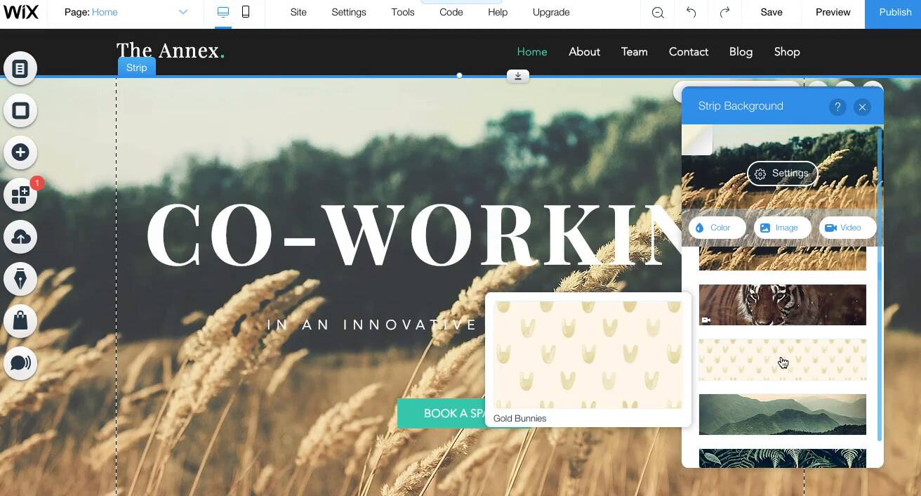 Honestly this is the type of thing you might not have notice when using Weebly— but it’s these details that make Weebly so easy to use. By contrast, Wix just stacks additional interfaces on top of your website when editing a background: